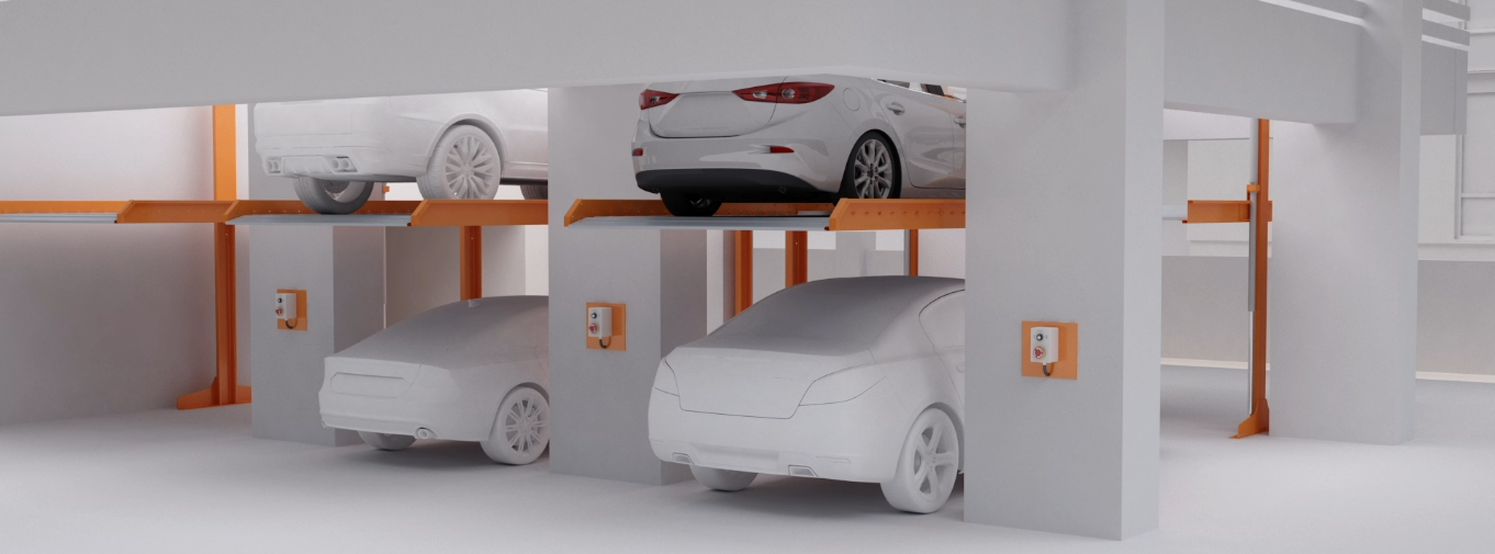 This mechanical parking system creates parking spaces for two cars, one at the ground level and another on the platform above. The lower car needs to be driven out to use the upper platform. D61 guarantees trouble-free parking and retrieval of the vehicle in a multi-level parking setup.